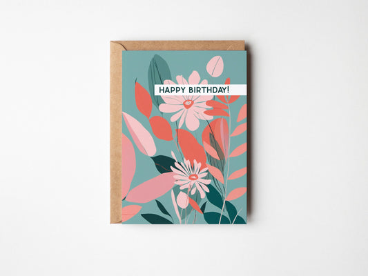 Minimalist Floral Birthday Card - Teal and Pink Abstract Design