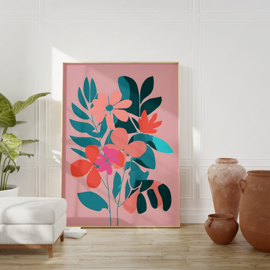 Contemporary Floral Wall Art - Minimalist Bold Teal Pink Print Multiple Sizes