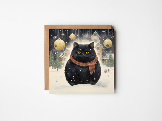 Funny Black Cat Christmas Card - Square Design with Snowy Scene