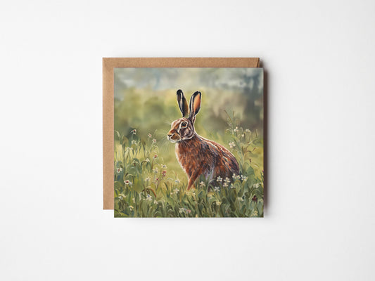 Hare in Field Greetings Card - Blank Square