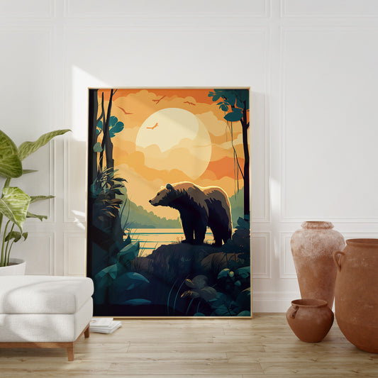 Stunning Nature Print Sunshine Bear Wall Art with Sunset and Mountains - Perfect for Gallery Wall