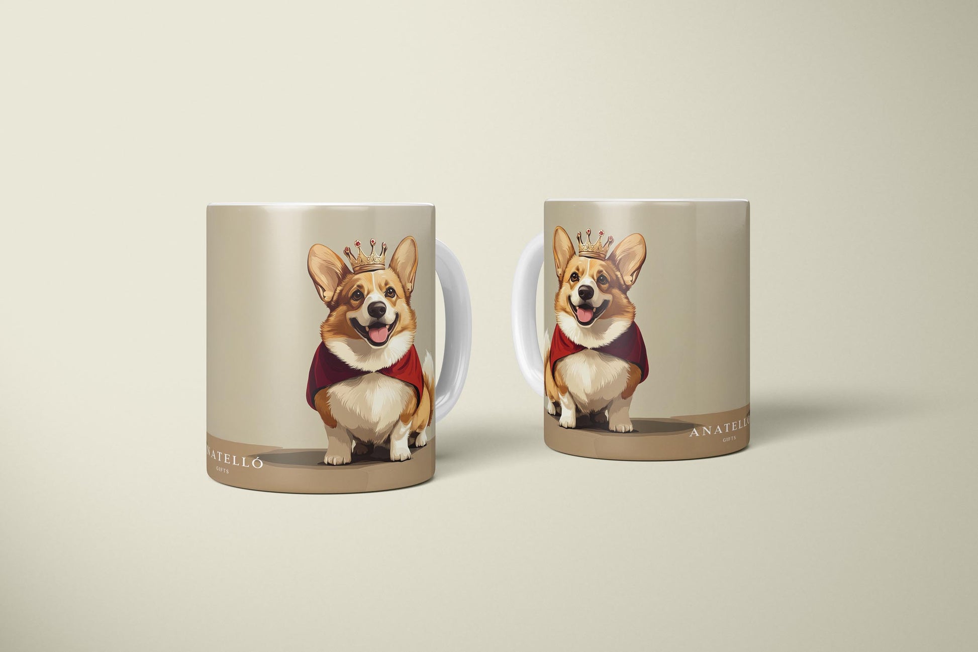 Corgi King Beige Background - This beautiful ceramic mug is perfect for any event of the day. Your morning coffee, a hot chocolate, or any other hot beverage you enjoy. The mug is glossy white and the prints come out beautifully and vividly on it. The print retains its quality and luster when used in both microwaves and the dishwasher.